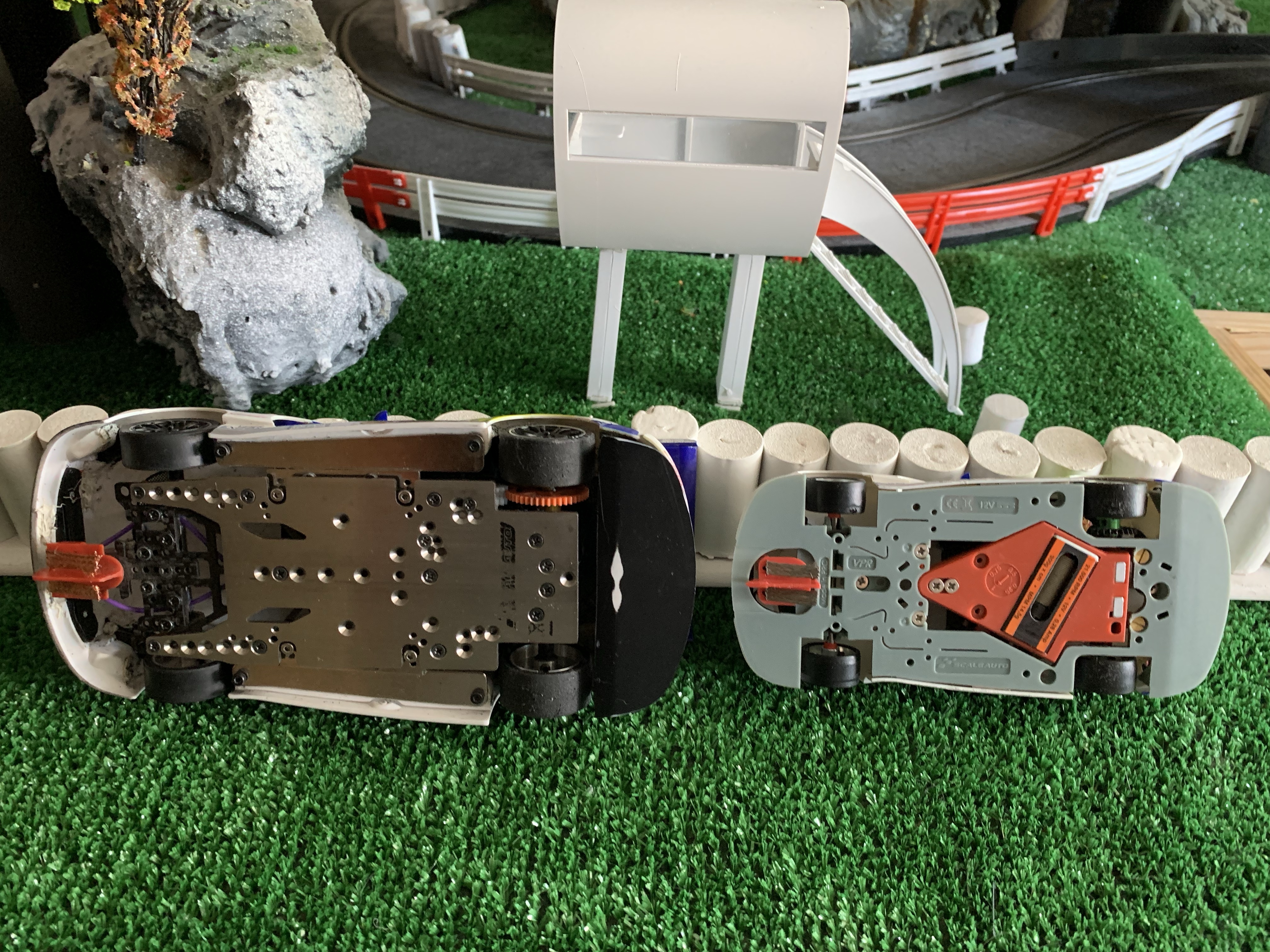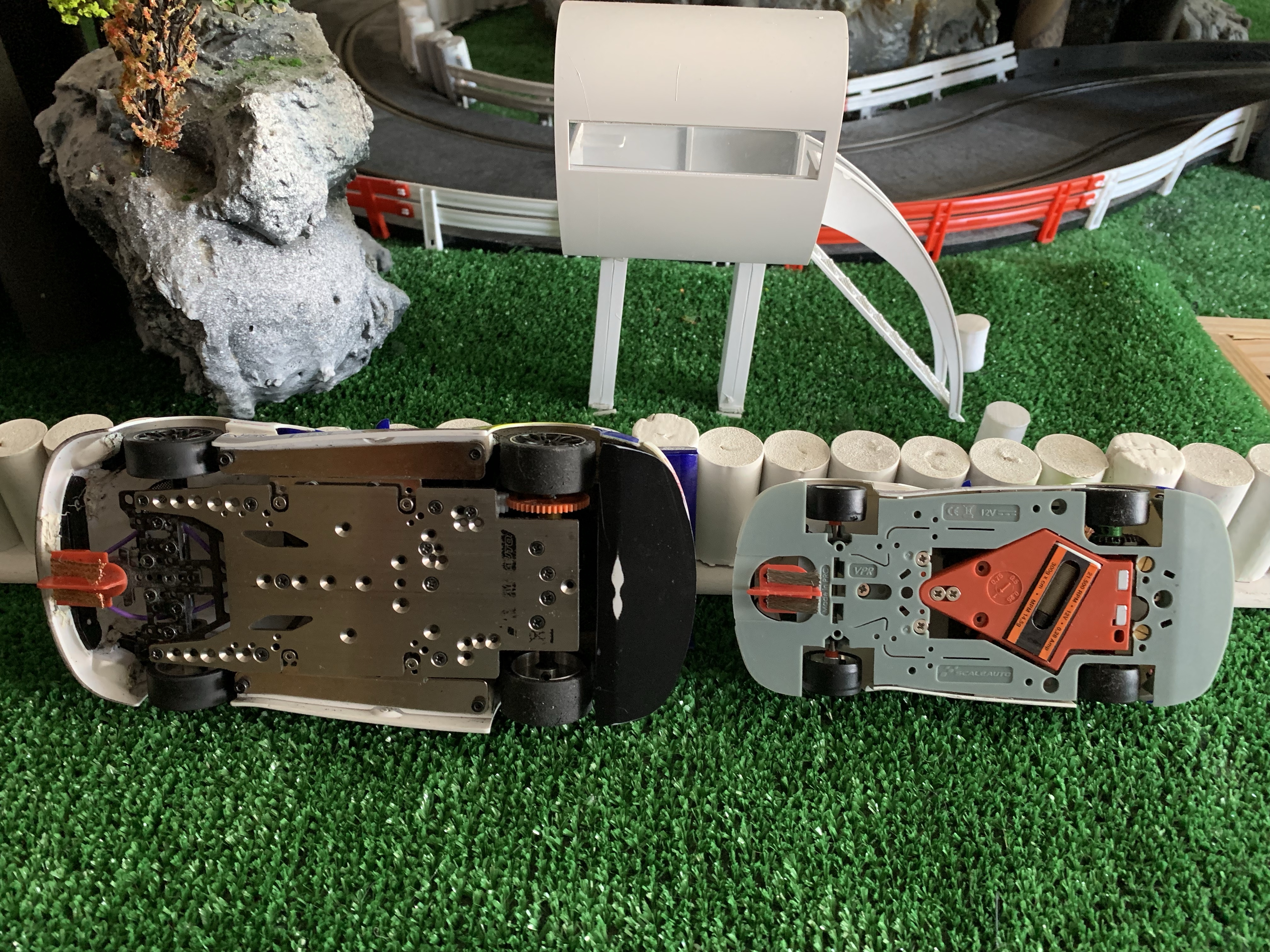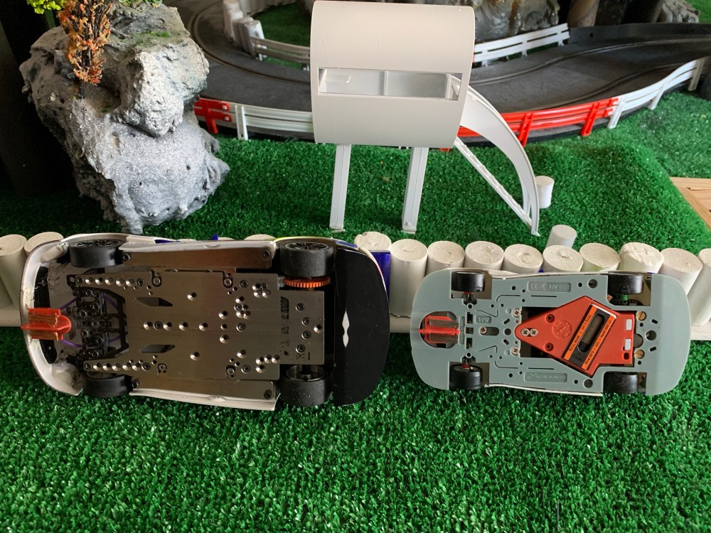 Here you have the mechanics «in the air» both for the 1/24 on the left and for 1/32 on the right; Do not be fooled by the sizes in the photos, the cars as you have seen in the previous photos are not the same; it is due to the scaling of the photo.