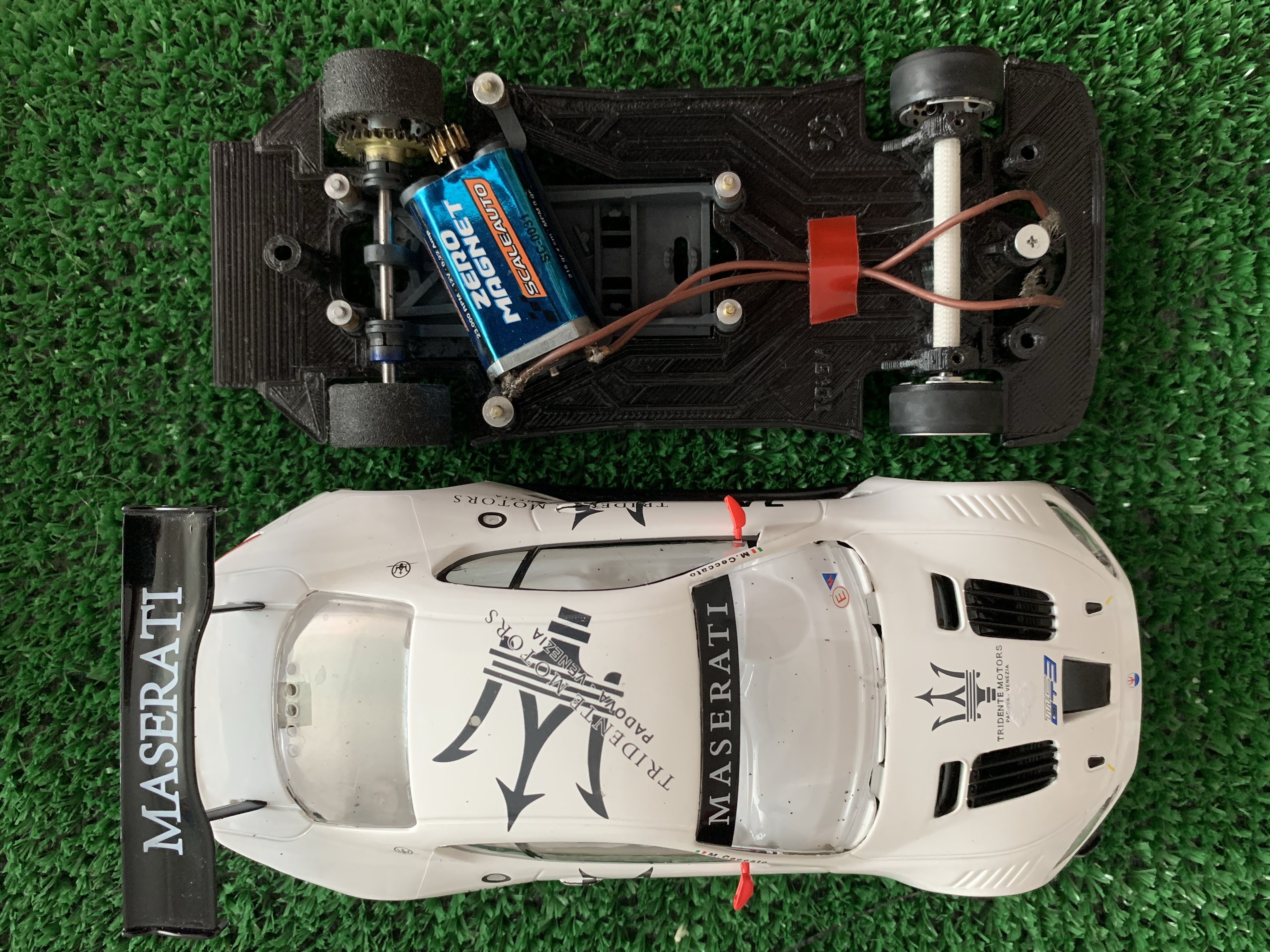 Desde el principio, la toma de contacto con el chasis de orígen, si bien no fue del todo negativa, no me terminaba de convencer. Como añadido, la pista de nuestro club, una Ninco añeja, tiene algún que otro bachecillo en alguno de los carriles y el chasis de serie perdía la compostura en según qué circunstancias. Como en slot, la confianza en tu coche es lo primero, esto ya iba a encaminar mi decisión de encuadrar el coche en la categoría superior de GT, lo que me permitiría cambiar el chasis por otro de mayor calidad.