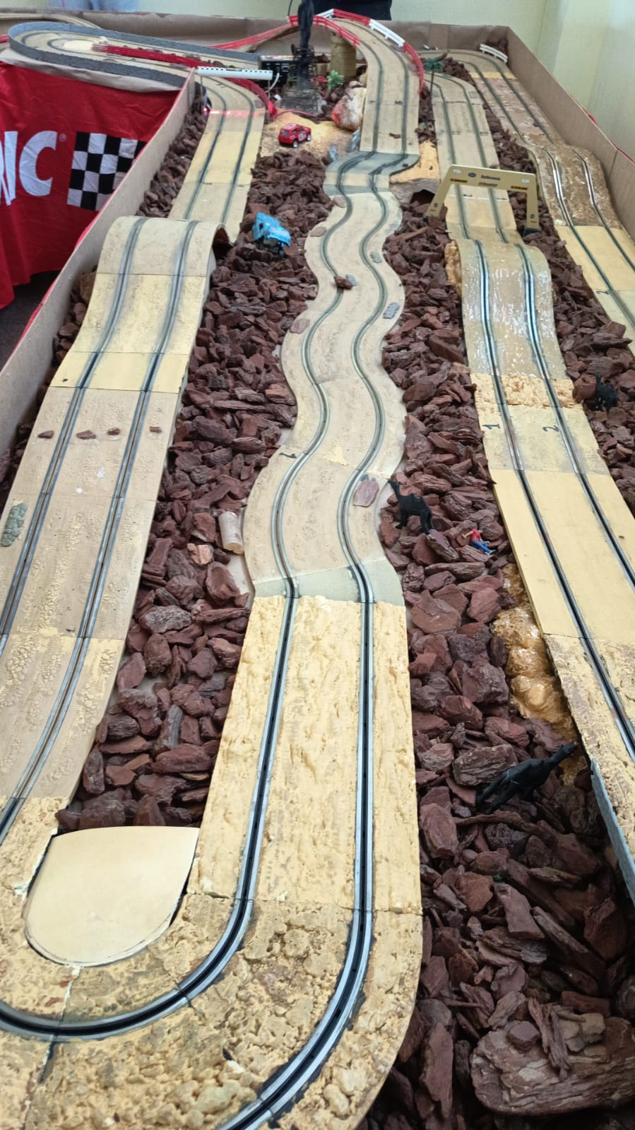 En mi opinión, la parte más gratificante. Es como ponerle la guinda al pastel. Disponiamos de material apto en el club para la decoración, y como donativo de algún tramo de rallyslot del club, apareció material de relleno que venía de perlas, como cortezas de madera, que permitian dar a una de las zonas de la pista de un aspecto de lo más africano. Las imágenes hablan por sí solas. Es muy bonito ver como evoluciona un montaje básico a su versión «casi definitiva». Y pongo énfasis en esto de «casi definitiva» porque siempre estamos inventando algo nuevo, y quedan detalles a ultimar antes de su estreno oficial.
