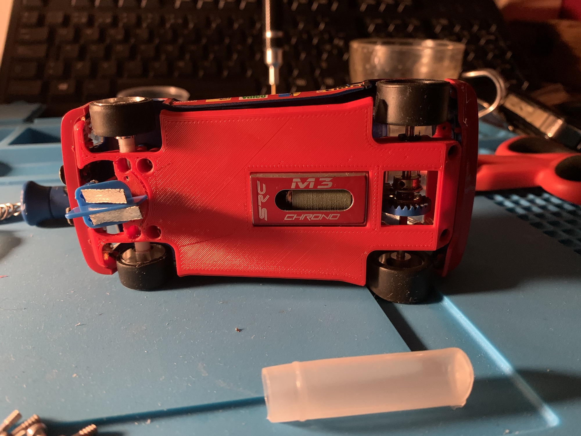 Tenía que encontrar un equilibrio entre mejora de prestaciones, pero sin lapidar dinerales innecesarios. Lo justo y necesario para llevarlo a otro nivel. Decido configurarlo con un chasis 3d Redslot y mecánica en línea. Si en algún momento algun conocido quiere venir al club a correr algun rally, le puedo prestar este coche ya que cumpliría con la reglamentación pertinente.
